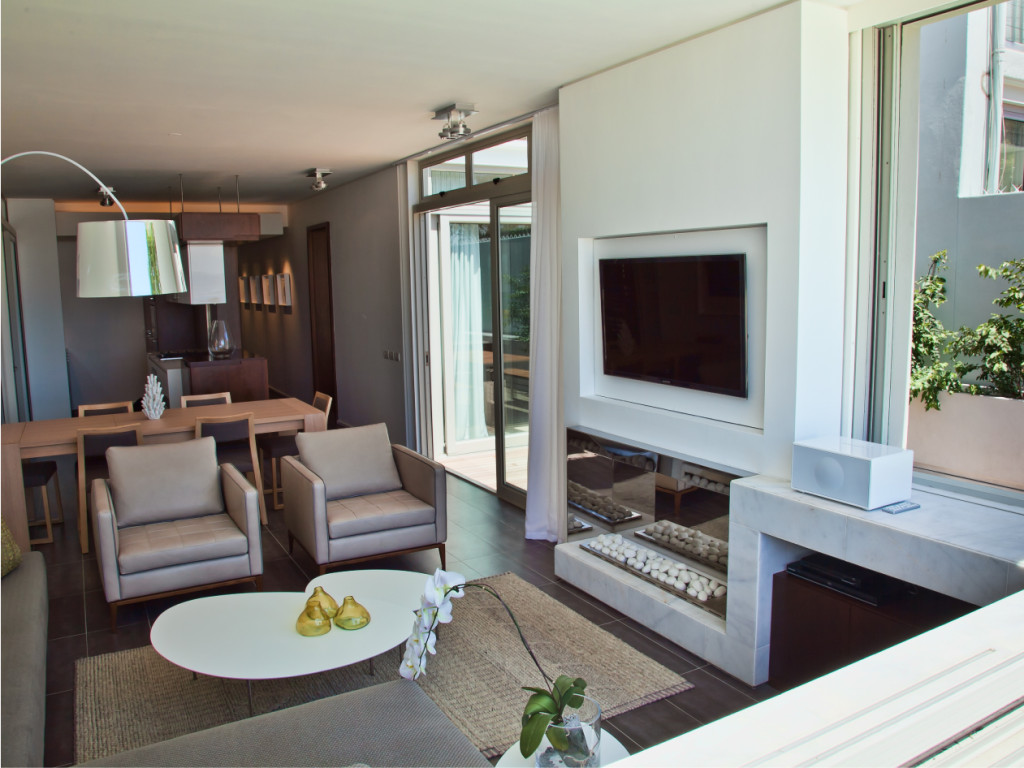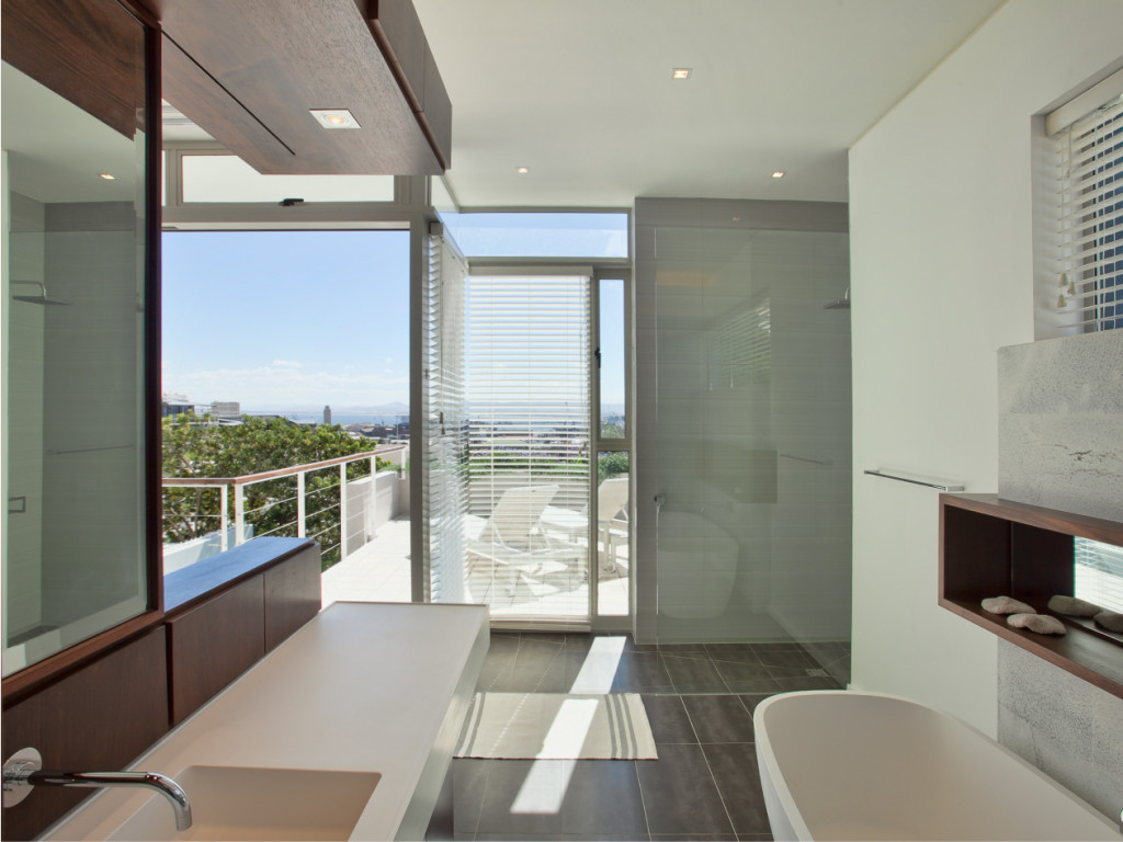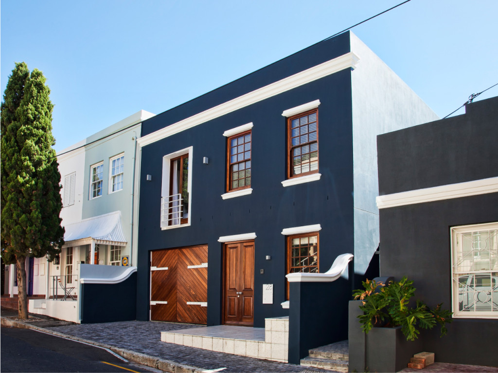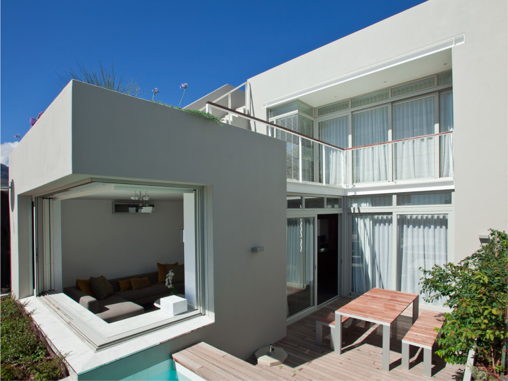 his house is situated on a 175m2 site in the De Waterkant Urban Conservation Area. The brief called for an extension to the existing single storey dwelling, to include a garage, an additional floor and roof terrace. The result is a house that optimizes view s toward theHarbour to the one side, whilst respecting the historical streetscape on the other. Behind the carefully detailed façade of Loader Street,an open plan contemporary space is revealed. Public functions, located on the ground floor, open up onto an outside entertainment areaand pool, with bedrooms on the first floor spilling out onto a private viewing deck. Freestanding joinery units organize interior spaces.The neutral material pallet and careful detailing allow s for a timeless architectural and interior design response.