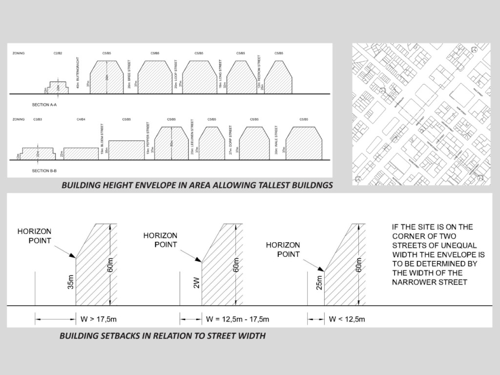 MEYER+VORSTER was part of a multi-disciplinary consortium to develop guidelines for Land-Use Management at the City of Cape Town as part of the Cape Town Inner-City Development Strategy (CCDS). The purpose of the study was to translate the private and public sector development visions, aims and frameworks in to a set of clear guidelines that provides a consistent basis for development decision making by public officials. As part of this, the study presented a vision for the future development of the Inner City, which took into account general urban form issues and set out a number of future development height scenarios. The project also focused on how to translate urban design good practice into tangible land use management tools.